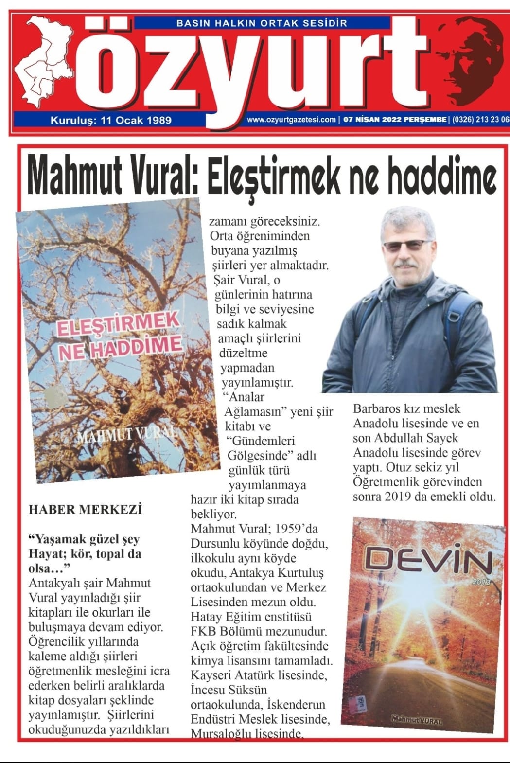 Antakya’nın zengin kültürel ve tarihsel dokusunu ilham alarak kaleme alınan Mahmut Vural’ın yeni şiir kitabı, okuyuculara bu kadim şehrin ruhunu ve evrensel temalarını sunan benzersiz bir pencere aralıyor. Eleştirmek ne Haddime adlı bu eser, hem yerel motifleri hem de evrensel insan deneyimlerini harmanlayarak, edebiyat severleri derin bir düşünce ve duygu yolculuğuna davet ediyor.
